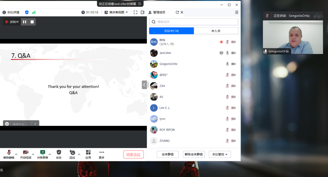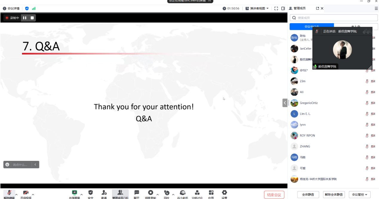本次培训围绕多个主题展开。在“课程导入”环节,Jan老师分享了提升教师在英语课堂中自信教学的经验与方法。在“理解课堂环境”部分,Jan老师特别强调,全英文授课不仅仅是语言的转换,更关键的是了解授课对象,关注不同学生的期望、学习习惯和交流风格,倡导教师从跨语言、跨文化以及学习风格的差异出发,开展因材施教的教学设计。在“策略与实践”环节,Jan介绍了如何在英语交流中构建清晰表达、增强授课自信以及实施有效课堂互动的策略与技巧,分享了多种实用工具与教学案例。最后,Jan老师还为即将参加全英文师资遴选的教师们提供了针对性的指导与建议,鼓励大家勇于开口、自信表达,积极应对全英教学挑战。培训过程中,参训教师积极参与线上互动,与主讲嘉宾展开了热烈讨论和深入交流。